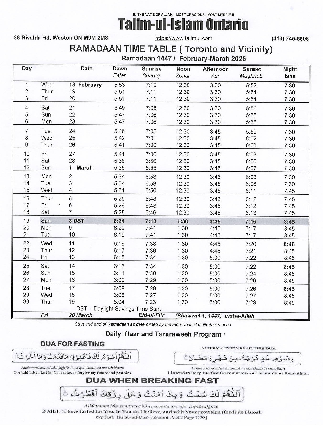 Since we will be moving our clocks to Daylight Saving Time on Sunday March 8th, 2026, which is the day Daylight Saving Time begins, be sure to check your clocks on that day. Be especially mindful of the time change, and when the Isha and first Taraweeh Prayer time begins at the Centre.