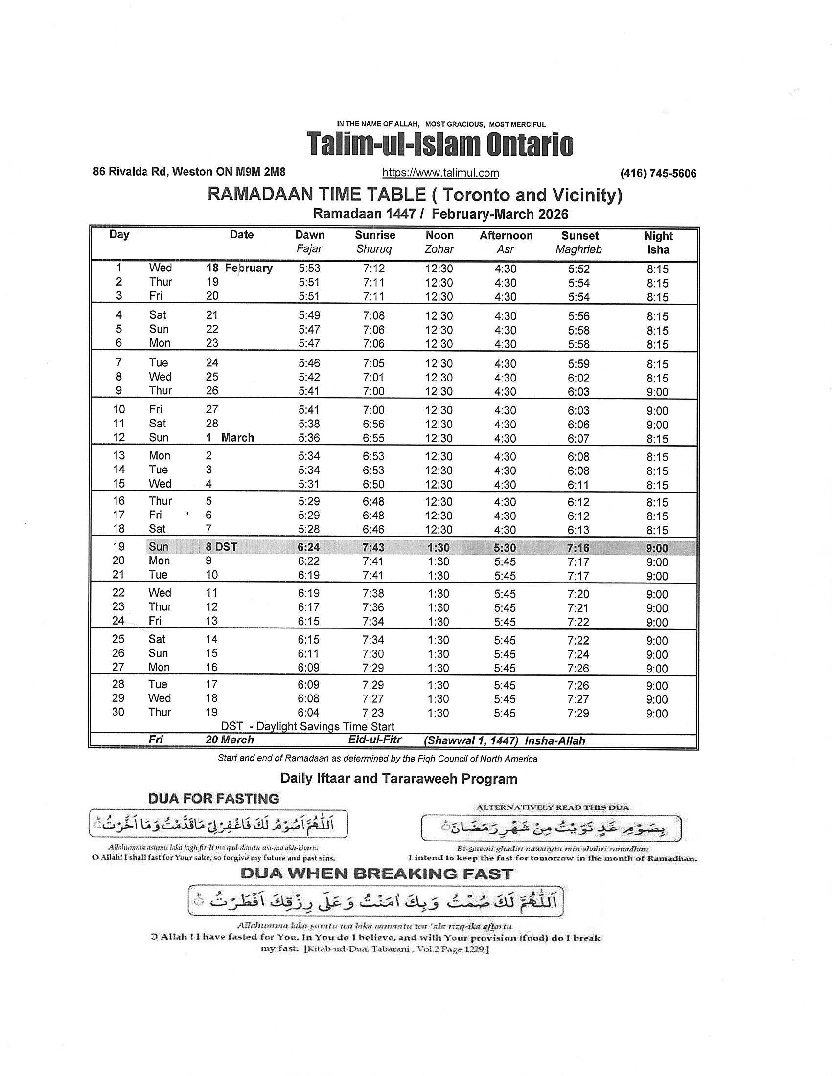 Since we will be moving our clocks to Daylight Saving Time on Sunday March 8th, 2026, which is the day Daylight Saving Time begins, be sure to check your clocks on that day. Be especially mindful of the time change, and when the Isha and first Taraweeh Prayer time begins at the Centre.